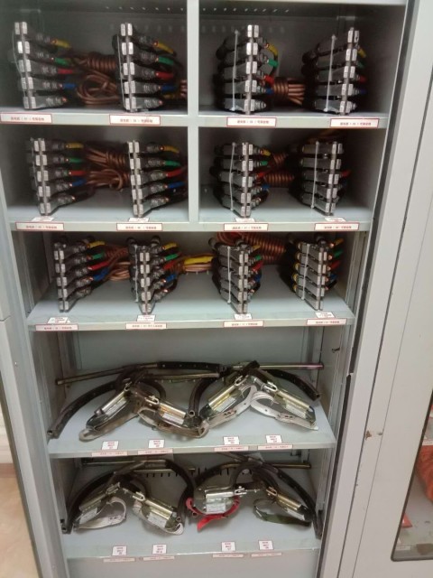 上面一組安全工具柜的存儲(chǔ)則是簡單暴力,兩層接地線,分別由支架固定,其中低層兩邊也分別放兩排。整體看起來整體規(guī)范,具有較強(qiáng)的視覺沖擊。