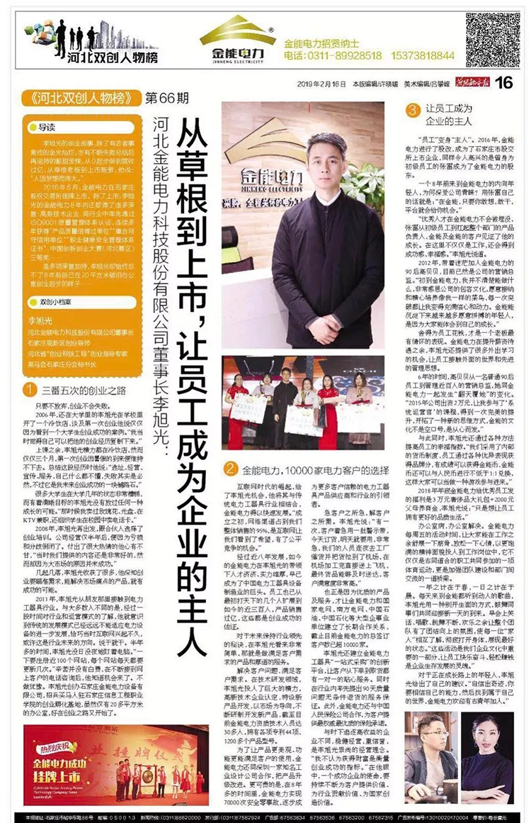 經過近八年發(fā)展,如今的金能電力在李旭光的帶領下人才濟濟、實力雄壯,早已成為了中國電力工器具設備制造業(yè)的巨頭。員工也已從最初打天下的幾個人擴展到如今的近三百人,產品銷售過億,掛牌上市,這些都是創(chuàng)業(yè)成功的佐證。