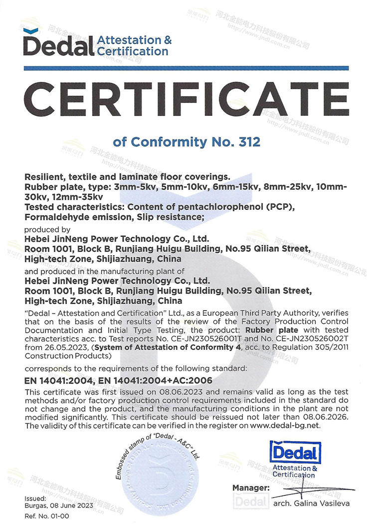 絕緣膠墊是電力安全不可或缺的一部分,其質(zhì)量和性能對(duì)于保護(hù)人員的安全至關(guān)重要。通過(guò)獲得CE認(rèn)證,并結(jié)合已于先前通過(guò)的國(guó)際電工協(xié)會(huì)IEC耐壓性能檢測(cè)報(bào)告,說(shuō)明金能電力絕緣膠墊的產(chǎn)品質(zhì)量、安全性和環(huán)保等級(jí)的肯定已經(jīng)得到主管機(jī)構(gòu)的認(rèn)可,產(chǎn)品符合歐盟的相關(guān)標(biāo)準(zhǔn)和法規(guī)要求。